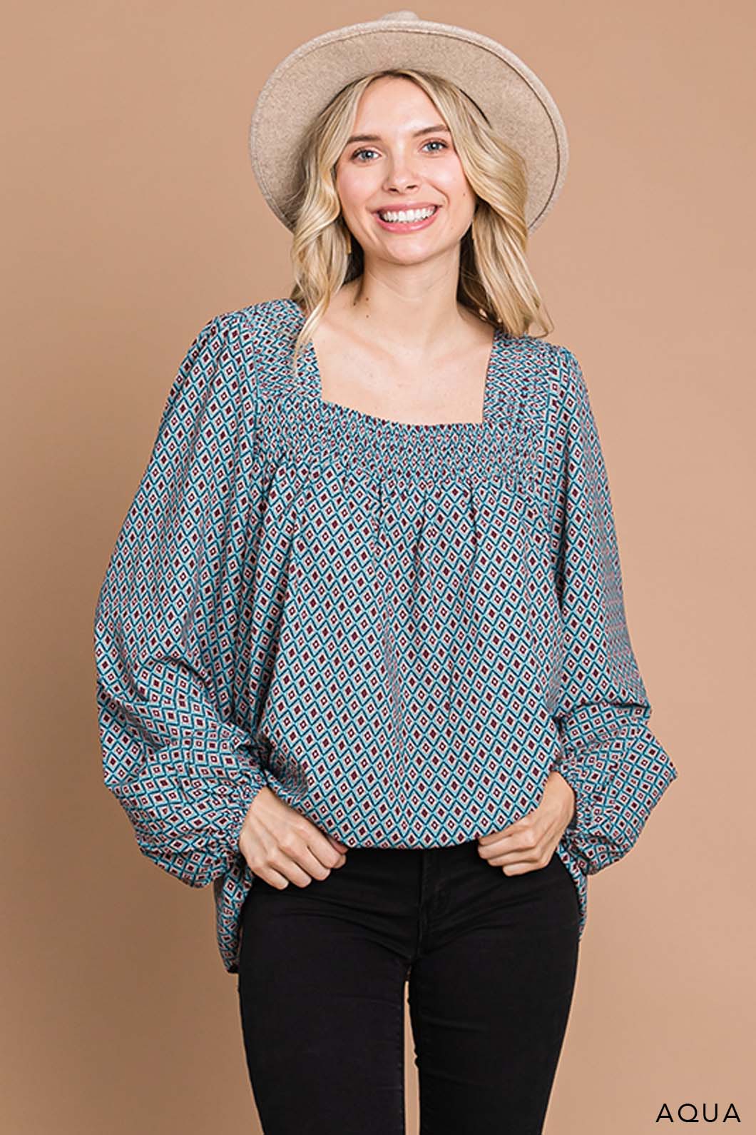 Embrace carefree vibes with this Women's Boho Tile Print Top, featuring a charming square smocking neckline that adds a flirty touch. The playful tile print brings a splash of artistic flair, perfect for sunny days or casual hangouts. Lightweight and breezy, this top keeps you comfortable while making a bold, boho-inspired statement wherever you go. Pair it with your favorite jeans or flowy skirts for an effortlessly fun look that captures the spirit of relaxed, stylish adventures.